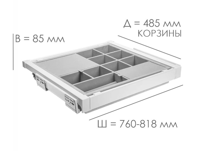 Ширина корзины регулируется в диапазоне 760 - 818 мм.