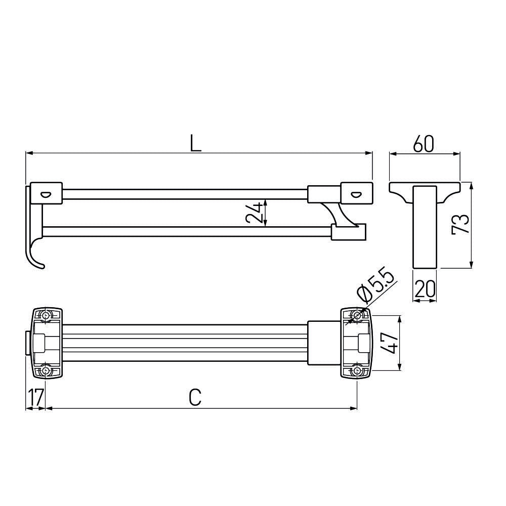 Обращаем внимание, что в наименовании товара указан габаритный размер штанги в задвинутом состоянии (L= 500 мм). Длина выдвижной части вешалки C = 470 мм.