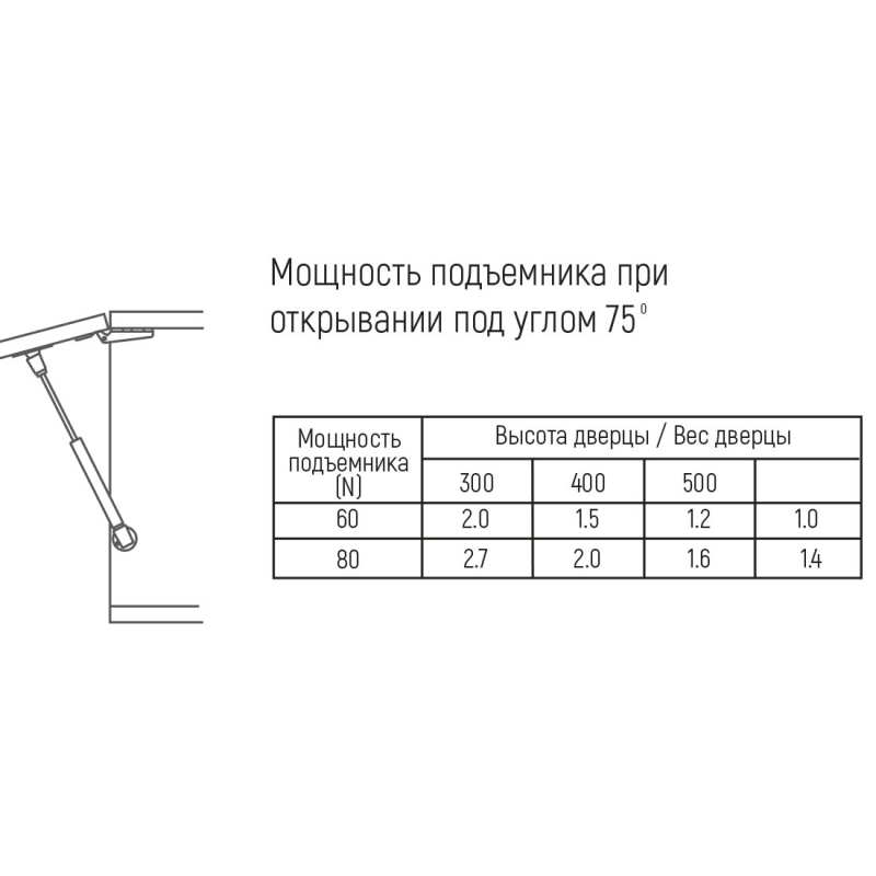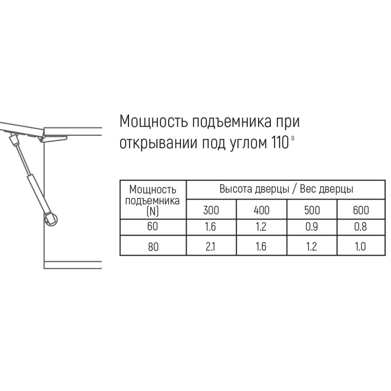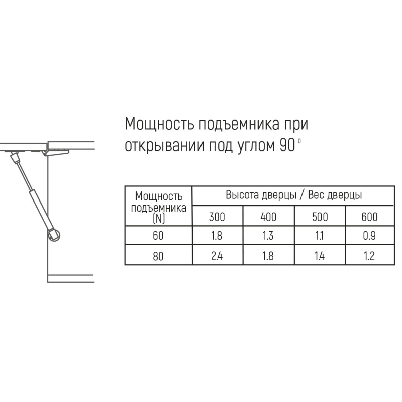 Длина подъёмника 160 мм делает модель удобной для узких и малогабаритных модулей, где обычные газлифты не помещаются. Угол открытия 90° обеспечивает комфортный доступ к содержимому шкафа.