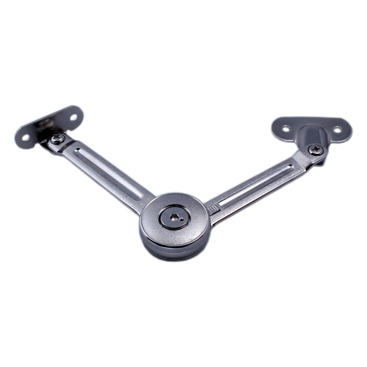 Общая длина механизма составляет 182 мм, а рабочая часть — 120 мм, что позволяет использовать кронштейн в компактных шкафах, барных секциях и верхних навесных модулях. Металлическая конструкция обеспечивает долговечность, а серое покрытие вписывается в любую мебельную фурнитуру.