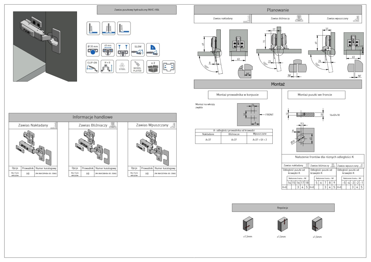 Петли поддерживают точную 3D-регулировку по всем направлениям и оснащены стандартной чашкой 35 мм. Модель поставляется без евровинта, крепление выполняется обычными саморезами.