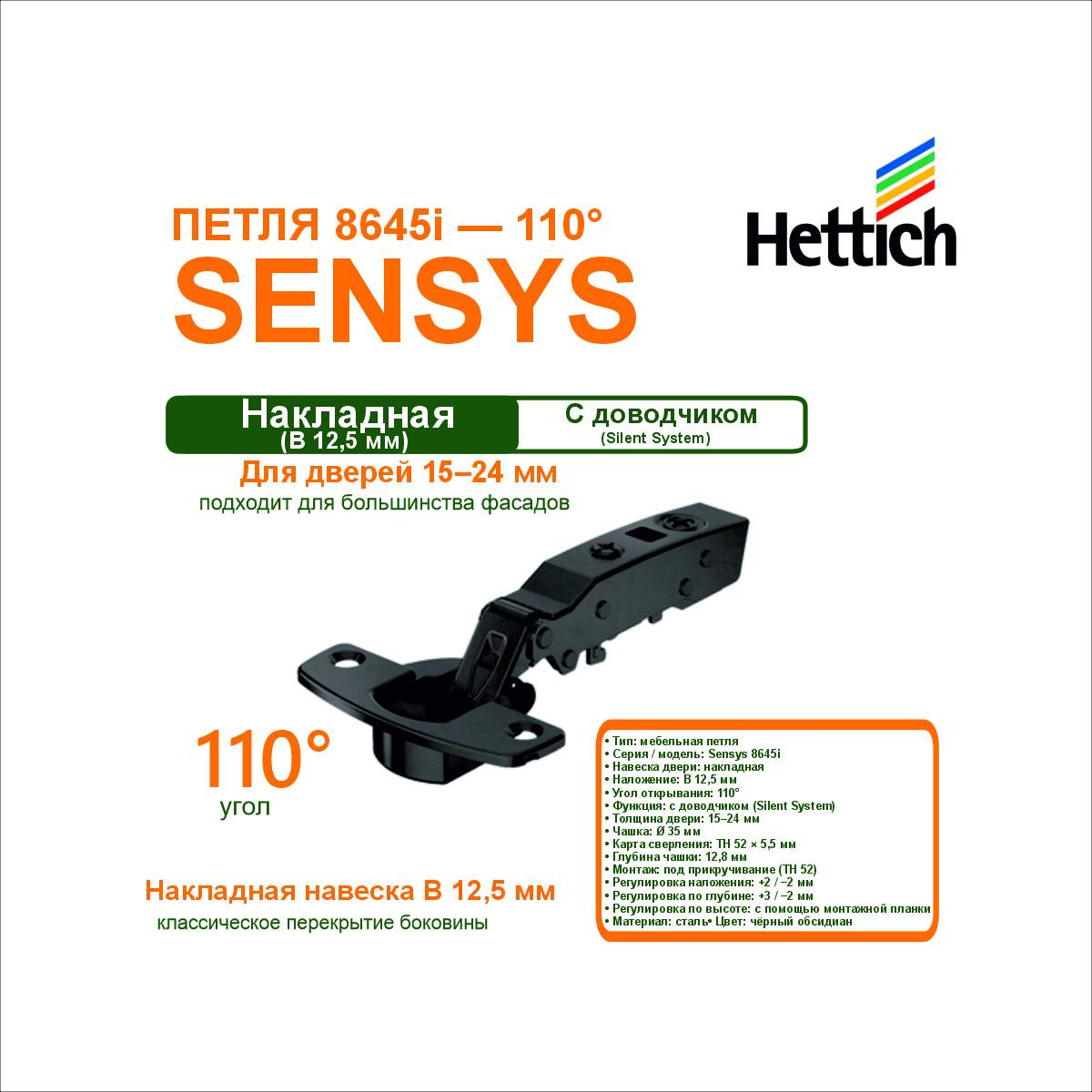 Петля Sensys 8645i TH52 предназначена для накладных дверей и обеспечивает угол открывания 110°. Оснащена доводчиком Silent System, который гарантирует плавное и бесшумное закрывание фасада.