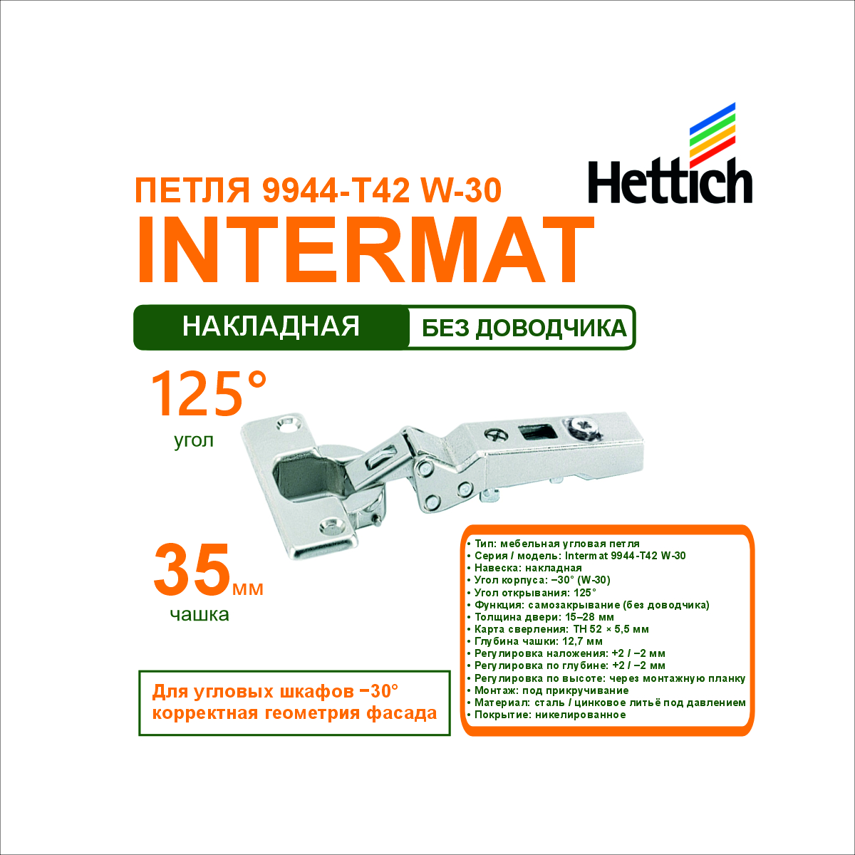 Петля Intermat 9944-T42 W-30 предназначена для накладных дверей угловых шкафов с углом корпуса −30° и обеспечивает широкий угол открывания 125°. Оснащена функцией самозакрывания за счёт пружинного механизма Intermat, без использования доводчика.
