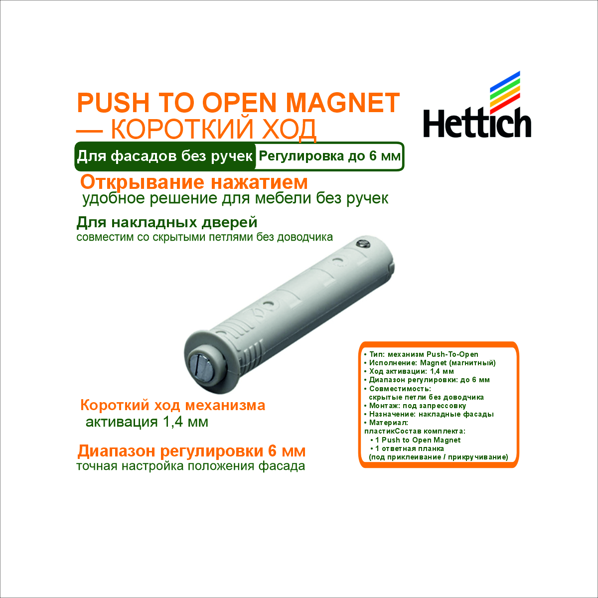 Механизм Push-To-Open Magnet (короткий ход) предназначен для фасадов без ручек и обеспечивает открывание двери лёгким нажатием.