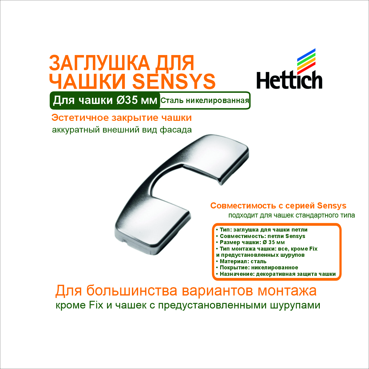 Заглушка предназначена для декоративного закрытия чашки петель Sensys Ø35 мм. Обеспечивает аккуратный внешний вид внутренней части фасада и защищает крепёжные элементы.