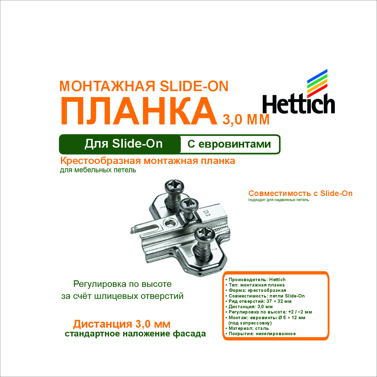 Крестообразная монтажная планка Slide-On предназначена для установки мебельных петель серии Slide-On. Оснащена регулировкой по высоте ±2 мм, которая осуществляется за счёт шлицевых отверстий и позволяет точно выровнять фасад после монтажа.