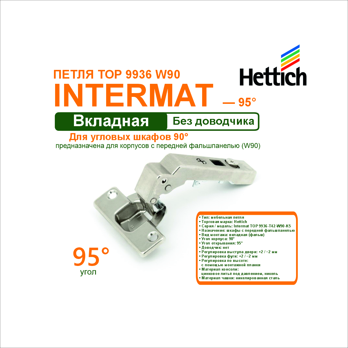 Петля Intermat TOP 9936-T42-W90-K5 предназначена для угловых шкафов с передней фальшпанелью (угол корпуса 90°). Обеспечивает угол открывания 95° и применяется для вкладных дверей.
