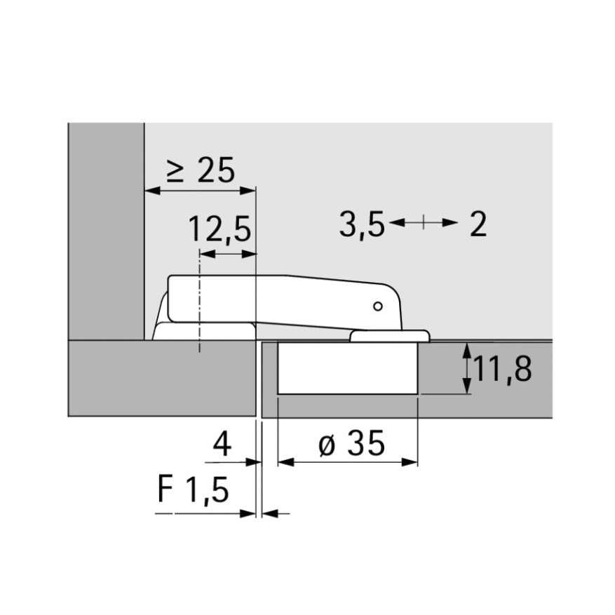 Монтаж надвижной, крепление осуществляется винтами Ø 3,5 × 16 мм. Диаметр чашки — 35 мм. Регулировка по высоте выполняется с помощью монтажной планки в диапазоне ±1,5 мм. Соответствует стандарту EN 15570, уровень 2.