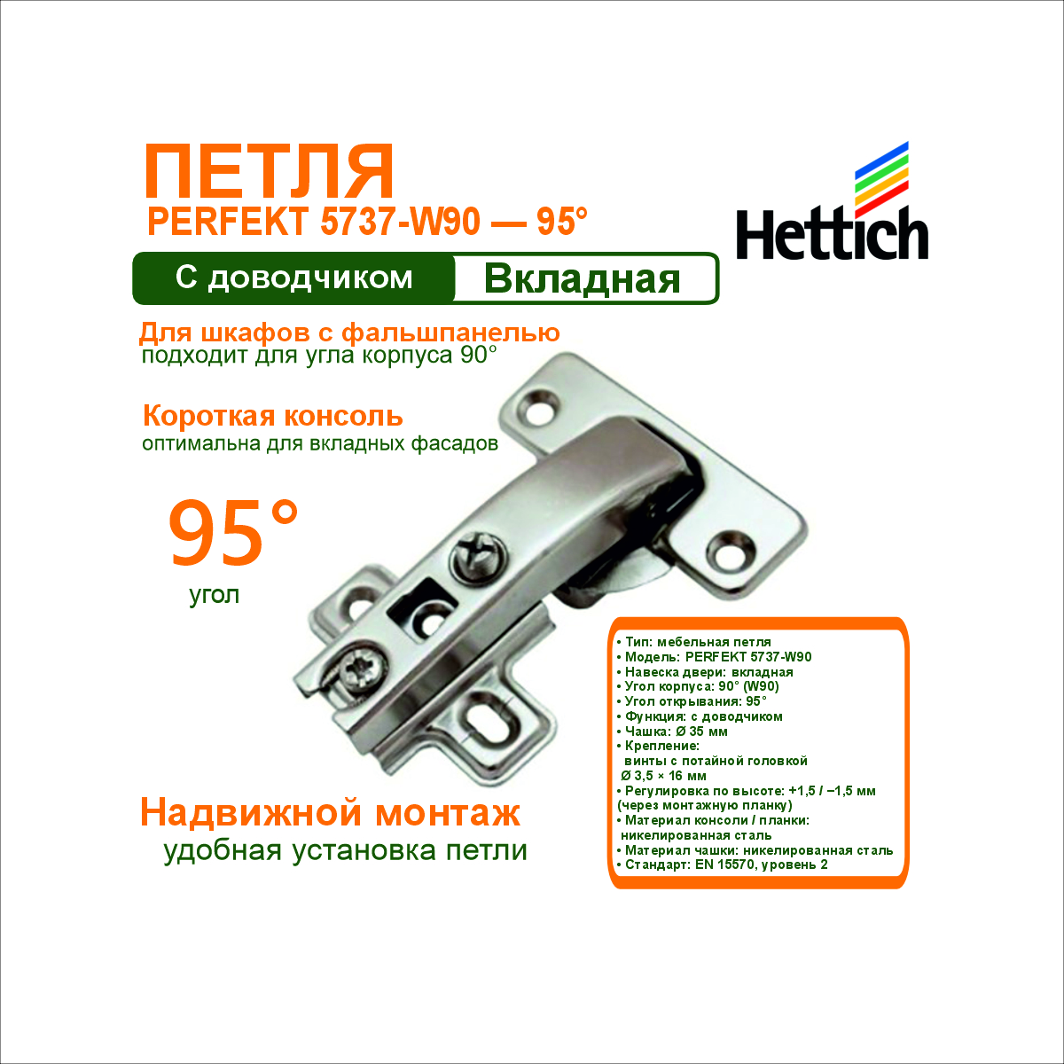 Петля PERFEKT 5737-W90 предназначена для вкладных дверей шкафов с передней фальшпанелью и углом корпуса 90°. Оснащена доводчиком, обеспечивающим плавное закрывание фасада.