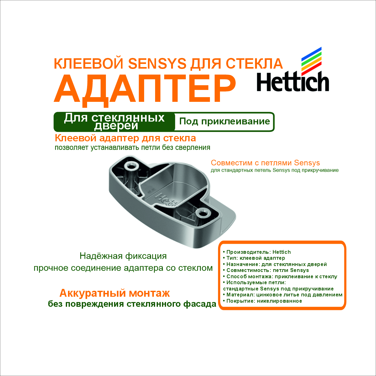 Клеевой адаптер Sensys предназначен для установки стандартных мебельных петель Sensys на стеклянные двери без сверления стекла. Адаптер приклеивается непосредственно к стеклянному фасаду и позволяет использовать петли Sensys, рассчитанные на прикручивание.