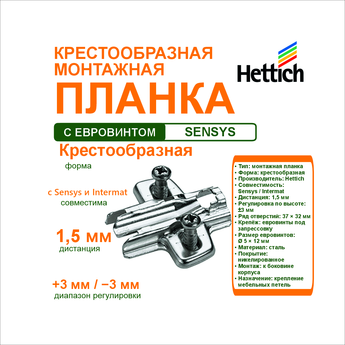 Крестообразная монтажная планка Hettich с дистанцией 1,5 мм предназначена для установки мебельных петель серий Sensys и Intermat. Обеспечивает точное позиционирование петли и стабильную работу фасада.