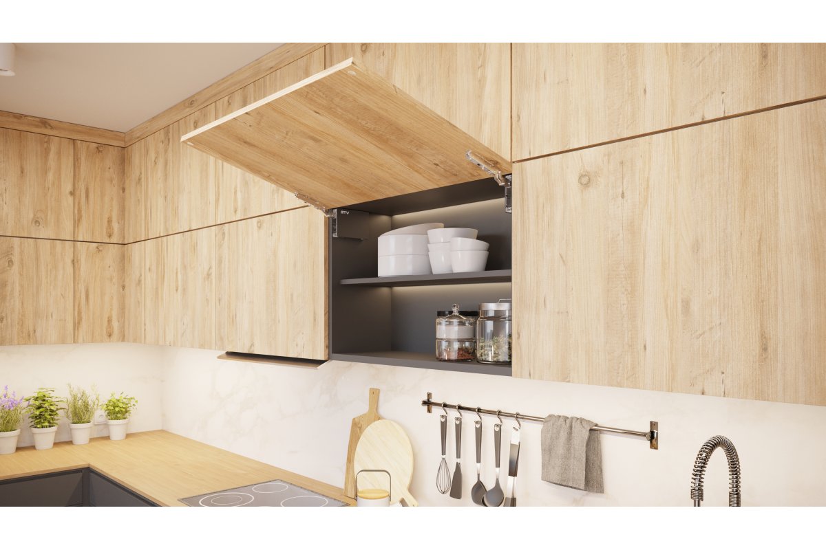 Подъёмник HORIZON soft close, средний коэффициент подъемной силы 1100-2250, высота фасада 300-650 мм, белый - функциональная мебельная фурнитура, предназначенная для открывания фасада. Для надежного и долгосрочного функционирования, подъемники устанавливаются с левой и с правой стороны фасада.