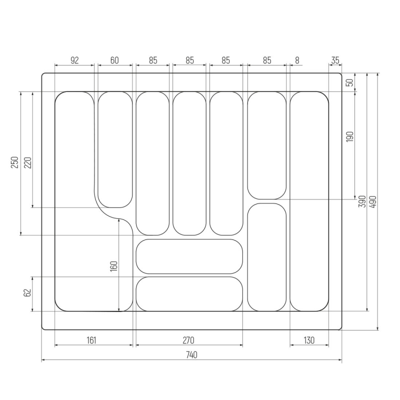 Внешний размер (с бортами) ШхГхВ: 740х490х55мм.