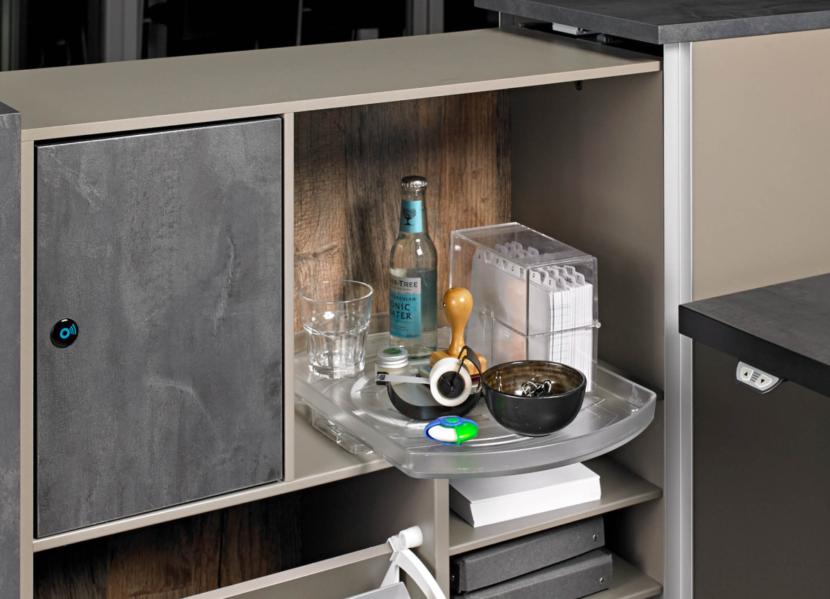 Полка независимо вращается вокруг своей оси на 360 градусов и частично выдвигается при повороте - это позволяет максимально использовать внутреннее пространство и обеспечивает комфортный доступ к содержимому