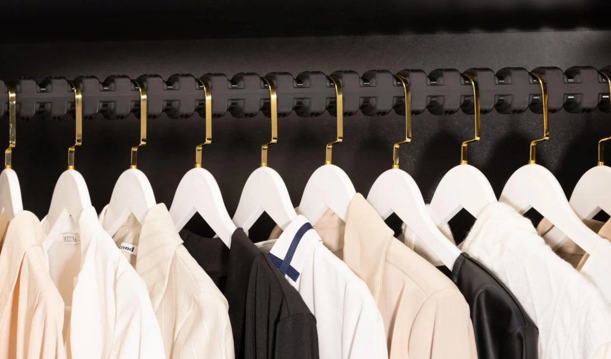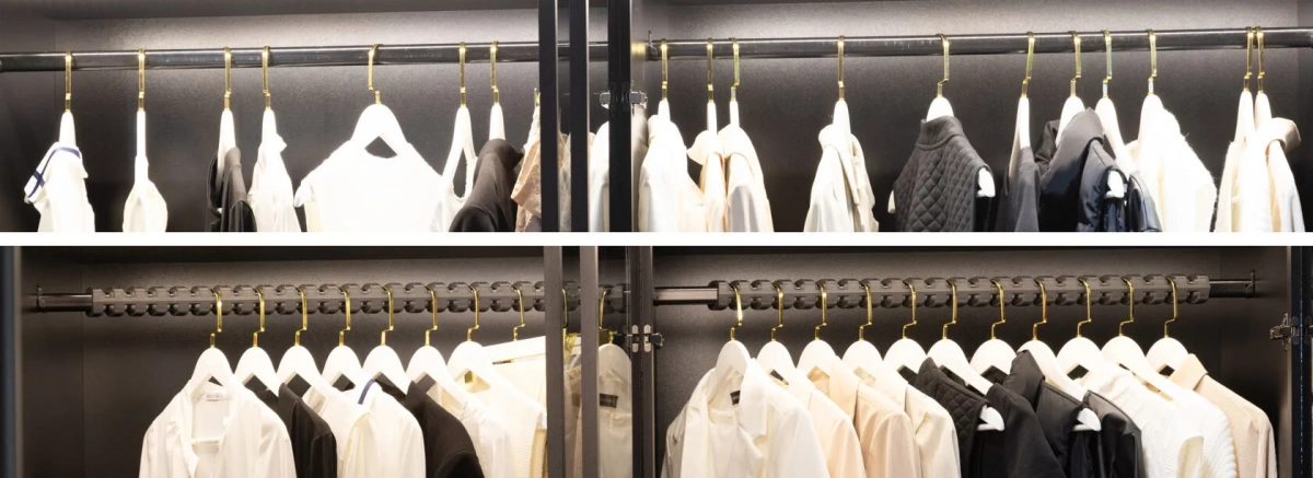 У Foscrinium универсальные посадочные углубления по всей длине. Можно размещать на одной штанге плечики с узкой и широкой формой крючков.