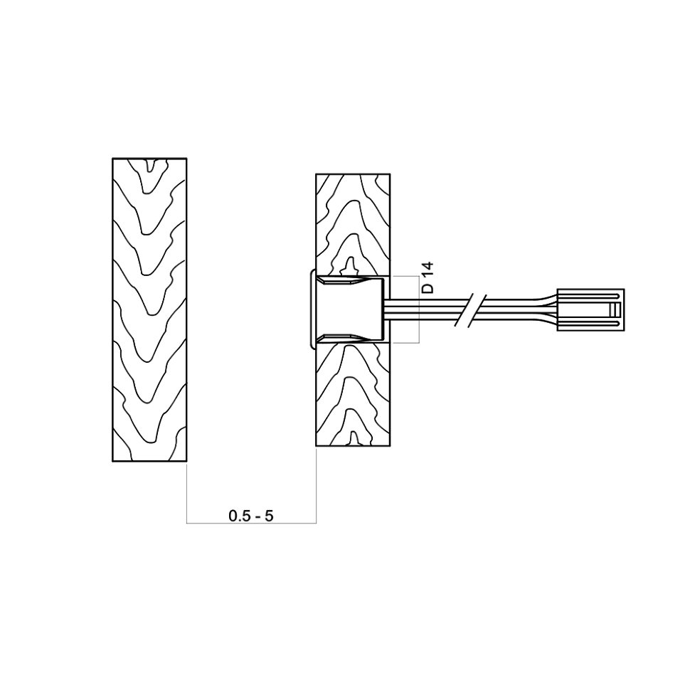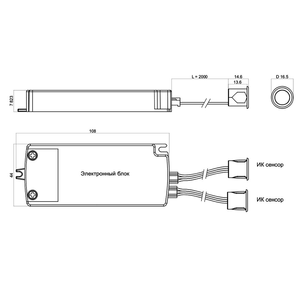 Инфракрасный выключатель PM-6-418B состоит из электронного блока и 2-х инфракрасных сенсоров.Инфракрасные сенсоры имеют компактные размеры диаметр 16 мм, необходимое отверстие, для их установки, диаметром 14 мм, что позволяет осуществить монтаж в панели ДСП стандартной толщины 16 мм.