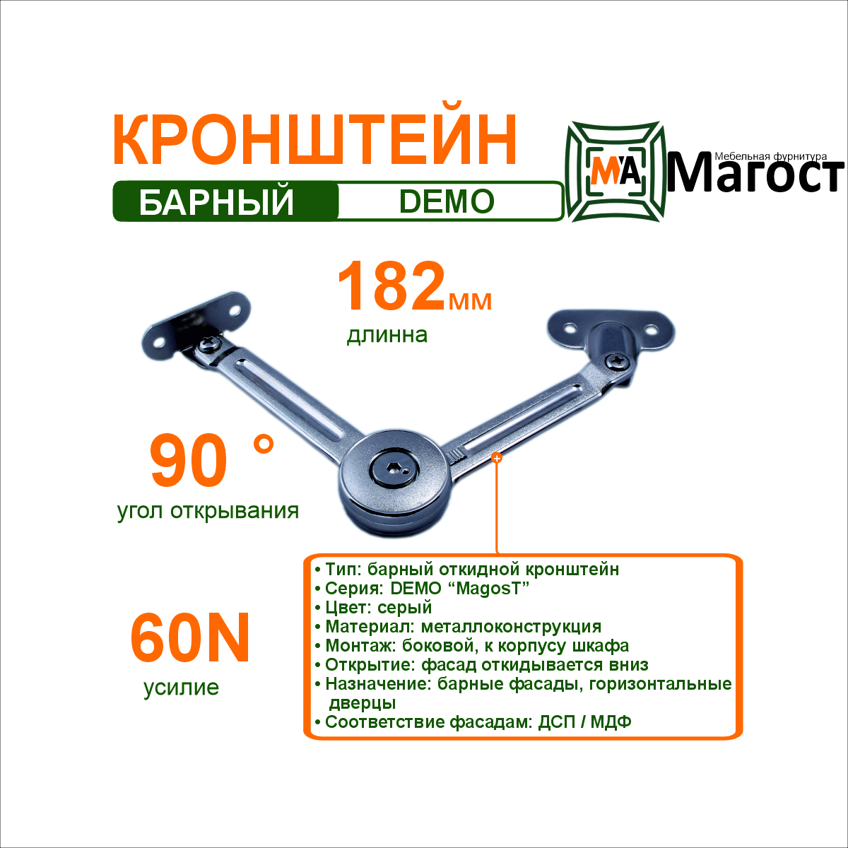 Барный кронштейн DEMO “MagosT” — это удобный и надёжный механизм для фасадов, открывающихся вниз. Усилие 60 N обеспечивает плавное и контролируемое опускание дверцы, а угол раскрытия 90° делает доступ к содержимому комфортным и безопасным.