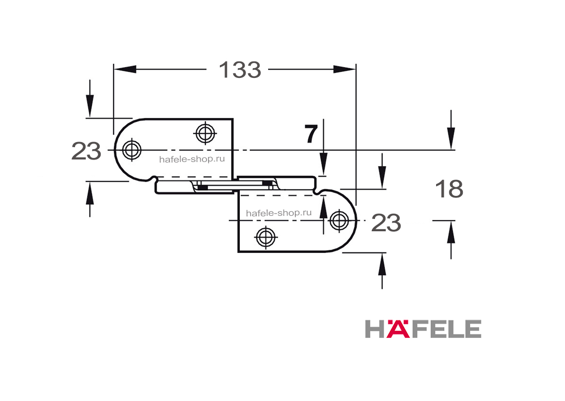 Изготовлен из прочной стали и обеспечивает надёжную фиксацию при эксплуатации. Монтаж осуществляется с помощью шурупов для ДСП. Размеры шарнира указаны на дополнительном изображении и используются для точной установки.