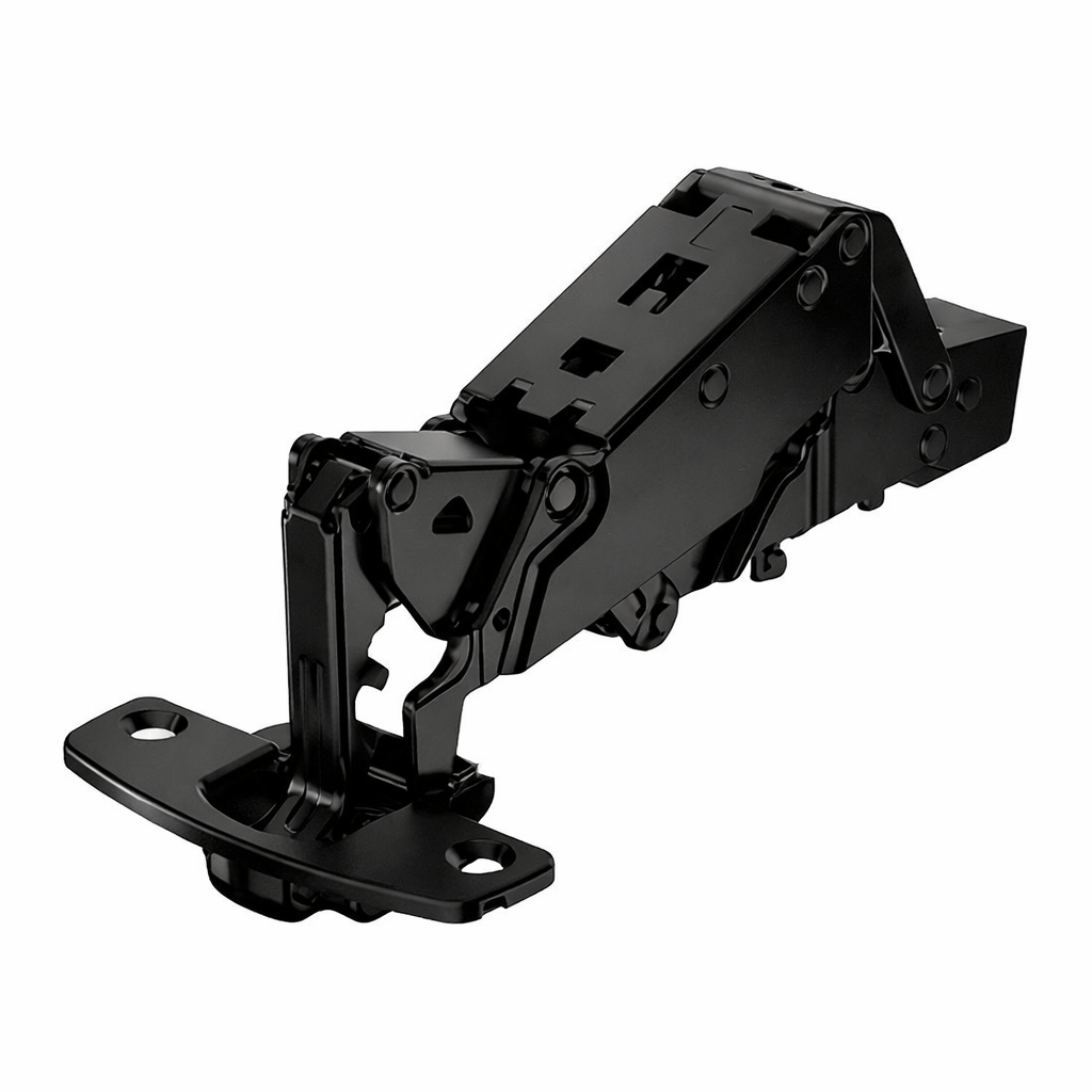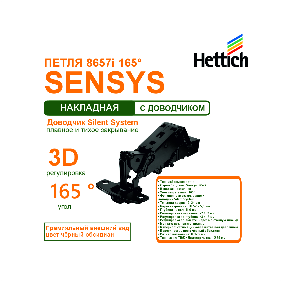 Петля оснащена интегрированным доводчиком Silent System, обеспечивающим плавное и бесшумное закрывание двери, а также функцией самозакрывания. Используется чашка TH52 диаметром 35 мм. Накладная навеска с наложением B 12,5 мм подходит для стандартных мебельных корпусов.