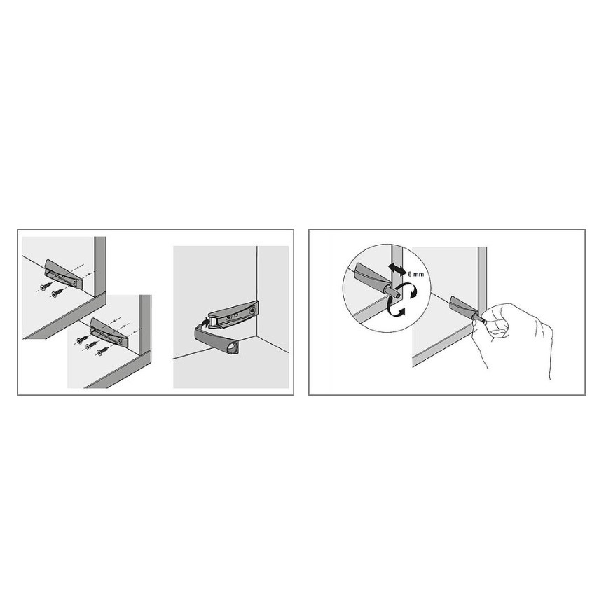 Применяется со скрытыми петлями без функции самозакрывания. Подходит для накладной, вкладной навески и навески на среднюю стенку. Обеспечивает регулировку вылета до 6 мм, ход активации — 1,4 мм.
