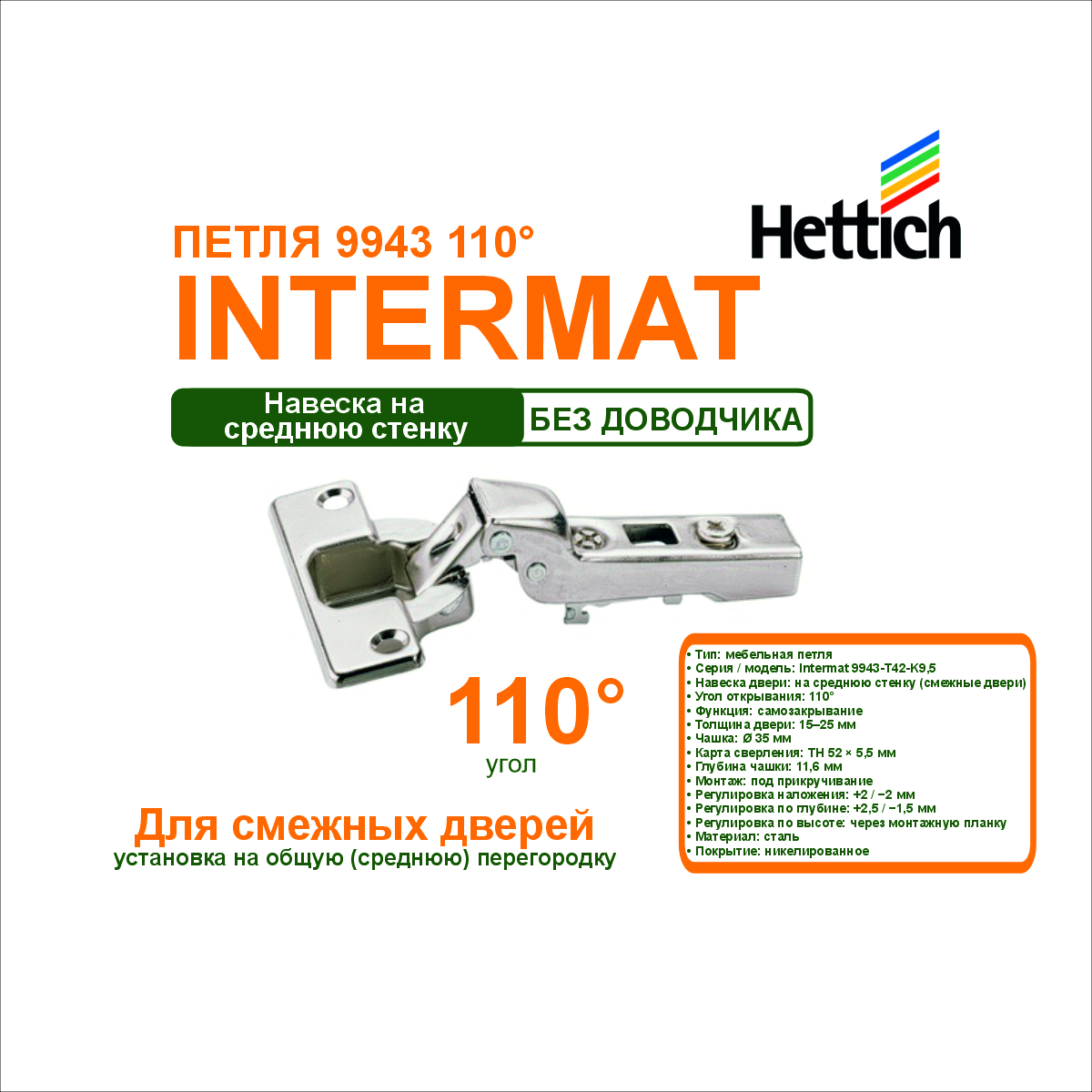 Петля Intermat 9943-T42-K9,5 предназначена для смежных дверей с установкой на среднюю стенку. Обеспечивает угол открывания 110° и оснащена функцией самозакрывания, что повышает удобство эксплуатации мебели.