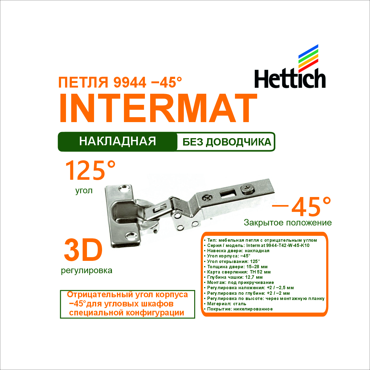 Петля Intermat 9944-T42-W-45-K10 предназначена для накладных дверей в угловых шкафах с отрицательным углом корпуса −45°. Обеспечивает широкий угол открывания 125° при корректном положении фасада в закрытом состоянии.