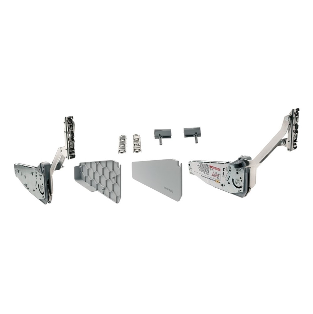 - 1 комплект фурнитуры для подъема створок вперед (по 1 штуке, левая / правая, включая крепления лицевой панели для откидных створок из древесины или с широкой алюминиевой рамой, инструкцию по монтажу и бумажный сверлильный кондуктор)