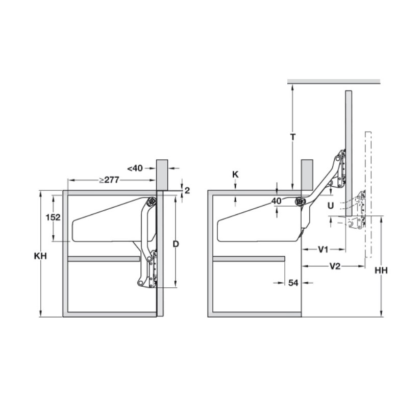 При ширине откидной створки ≥ 1800 мм используйте два комплекта Häfele Free up.