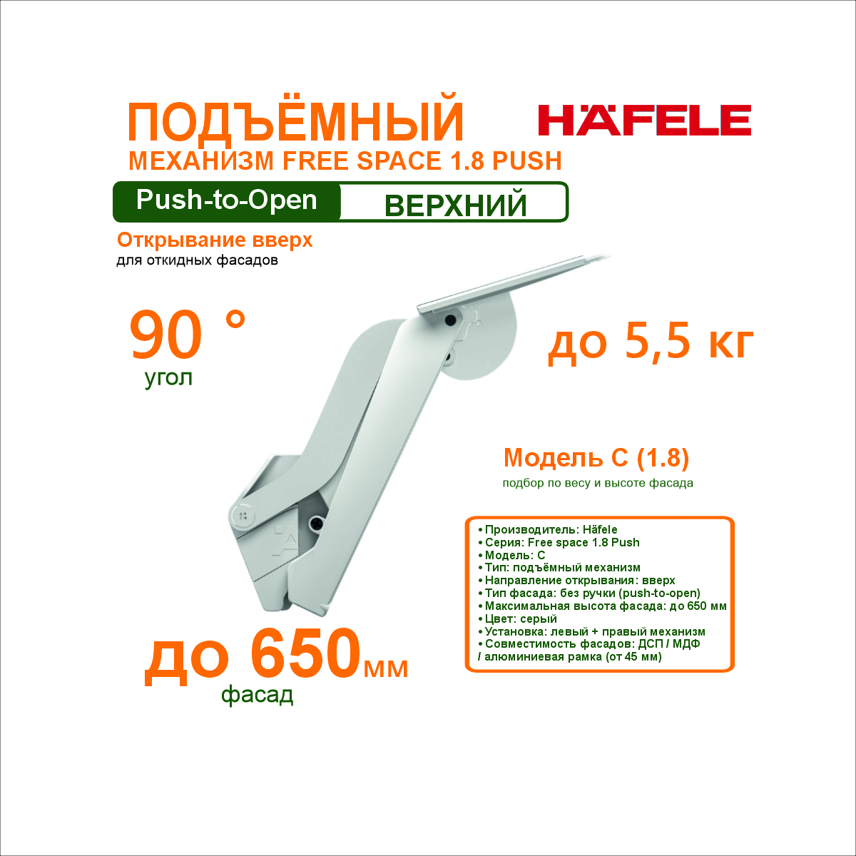Подъёмный механизм Hefele Free space 1.8 Push, модель C предназначен для откидных фасадов без ручки и обеспечивает удобное открывание вверх по технологии push-to-open. Модель рассчитана на фасады высотой до 650 мм и весом примерно 2,7–5,5 кг (в зависимости от высоты).