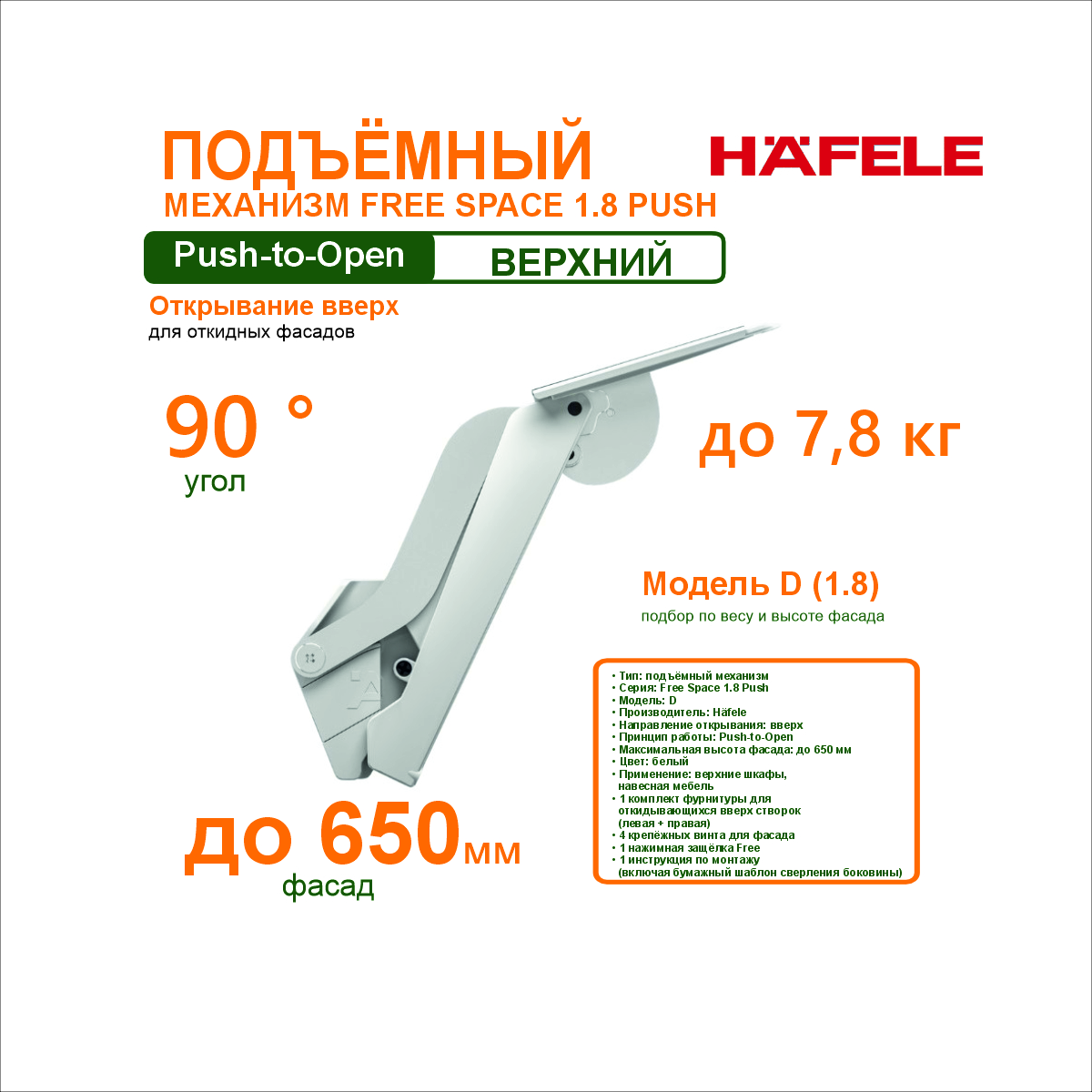 Подъемный механизм Free space 1.8 push Модель D Белый купить в магазине мебельной фурнитуры https://rmkmasterium.ru/