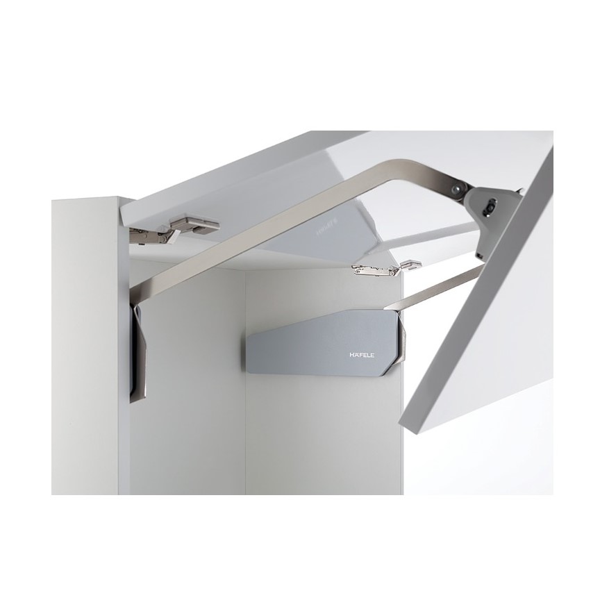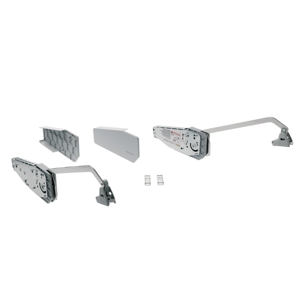1 Комплект фурнитуры для складывающихся вверх створок (по 1 штуке, левая / правая, включая крепления лицевой панели для откидных створок из древесины или с широкой алюминиевой рамой, инструкцию по монтажу и бумажный сверлильный кондуктор).